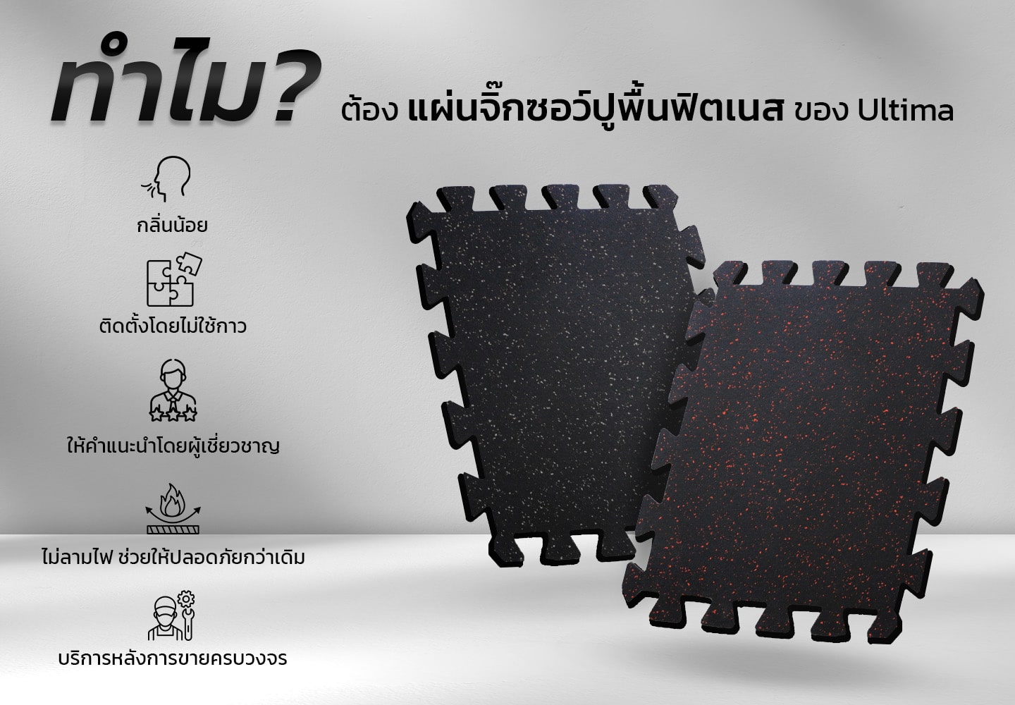 แผ่นจิ๊กซอว์ปูพื้นฟิตเนสของ Ultima คือ ความคุ้มค่า ติดตั้งง่าย คุณภาพเกรดส่งออก ซื้อครั้งเดียวใช้งานได้เกิน 10 ปี ซึ่งแผ่นจิ๊กซอว์ปูพื้นฟิตเนสของเราถูกออกแบบให้ช่วยลดแรงกระแทก กันลื่น ช่วยเก็บเสียง และป้องกันพื้นร้าวที่เกิดจากการใช้งานเครื่องออกกำลังกาย