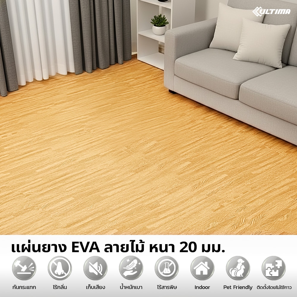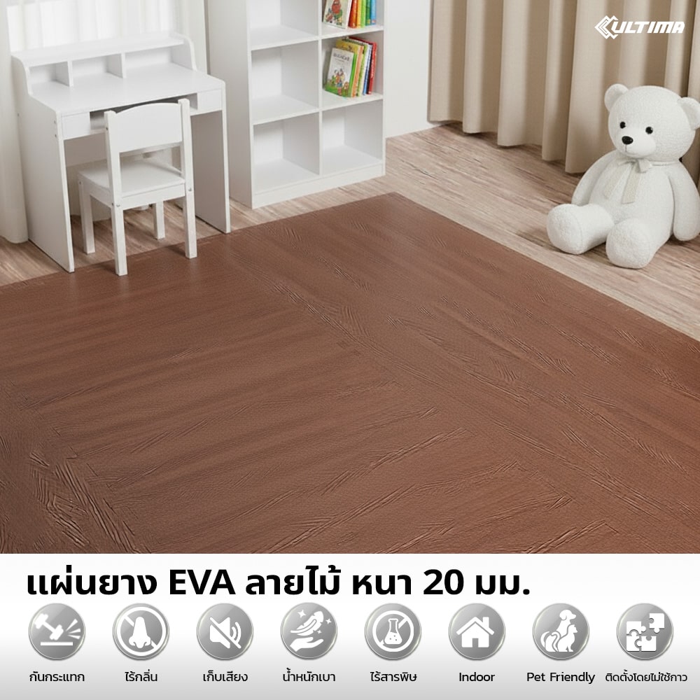แผ่นโฟมกันกระแทก EVA ลายไม้ หนา 20 มม. สามารถใช้ปูพื้นเพื่อ กันลื่น กันกระแทก สามารถใช้เพื่อปูพื้นสำหรับโรงฝึกศิลปะการต่อสู้ต่างๆ เช่น มวยไทย เทควันโด ยูโด รวมไปถึงปูพื้นฟิตเนส ทั้งในโซนยกน้ำหนัก ที่มีการยกดัมเบล บาร์เบล Smith Machine และ โซนคาร์ดิโอ เช่น ลู่วิ่งไฟฟ้า จักรยานอออกกำลังกาย เครื่องเดินวงรี คุณสมบัติ ดูดซับแรงกระแทก เก็บเสียงได้ดี และ สามารถติดตั้งได้ง่ายเพราะเป็นลักษณะเป็นจิ๊กซอว์